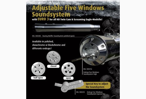 BSL Auspuffanlagen werden je nach Modell mit einem Krümmer Durchmesser von 2 1/4" (ca. 5,72 cm) am Zylinderanschluss bis 2 1/2" gefertigt. Der Endtopf bei den Euro 2 und Sportster BSL Auspuffanlagen hat einen Durchmesser von ca 62mm, Der neuen Euro 3 BSL Auspuffanlagen einen Durchmesser von ca. 70mm.