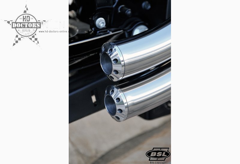 BSL Auspuffanlagen werden je nach Modell mit einem Krümmer Durchmesser von 2 1/4" (ca. 5,72 cm) am Zylinderanschluss bis 2 1/2" gefertigt. Der Endtopf bei den Euro 2 und Sportster BSL Auspuffanlagen hat einen Durchmesser von ca 62mm, Der neuen Euro 3 BSL Auspuffanlagen einen Durchmesser von ca. 70mm.